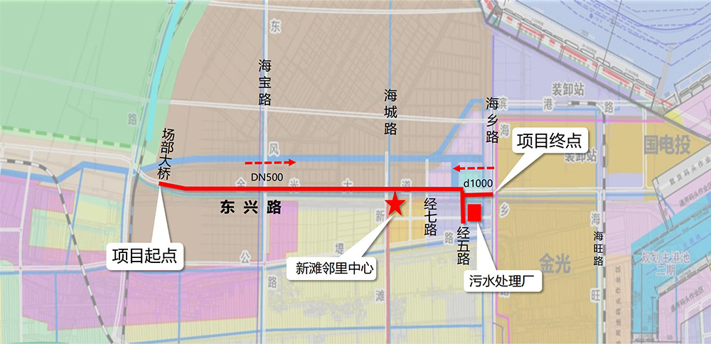 項(xiàng)目西起場部大橋,東至海鄉(xiāng)路,全長約7.4公里,總投資約3600萬元。其中,西段(場部大橋-經(jīng)五路)6.4公里為DN500壓力流管道,位于東興路北側(cè),負(fù)責(zé)轉(zhuǎn)輸污水處理廠以西范圍污水;東段(經(jīng)五路-海鄉(xiāng)路)1公里為d1000重力流管道,位于東興路南側(cè),負(fù)責(zé)轉(zhuǎn)輸污水處理廠以東范圍污水。近期先行實(shí)施經(jīng)七路至海鄉(xiāng)路段2.5公里污水管道,總投資約1500萬元。